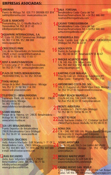 14. Casino Torrequebrada 15. Fuengirola Zoo 16. Aqua Vista 17. Parque Aquático Mijas 18. Karting Club Málaga 19. Hipódromo Costa Del sol 20. Funny Beach Marbella 21. Monte Aventura 22. Ticket To Ride 23. Bona Dea 24. Selwo Aventura 25. Briscas Nauticsport 26. Casino Nuevo San Roque